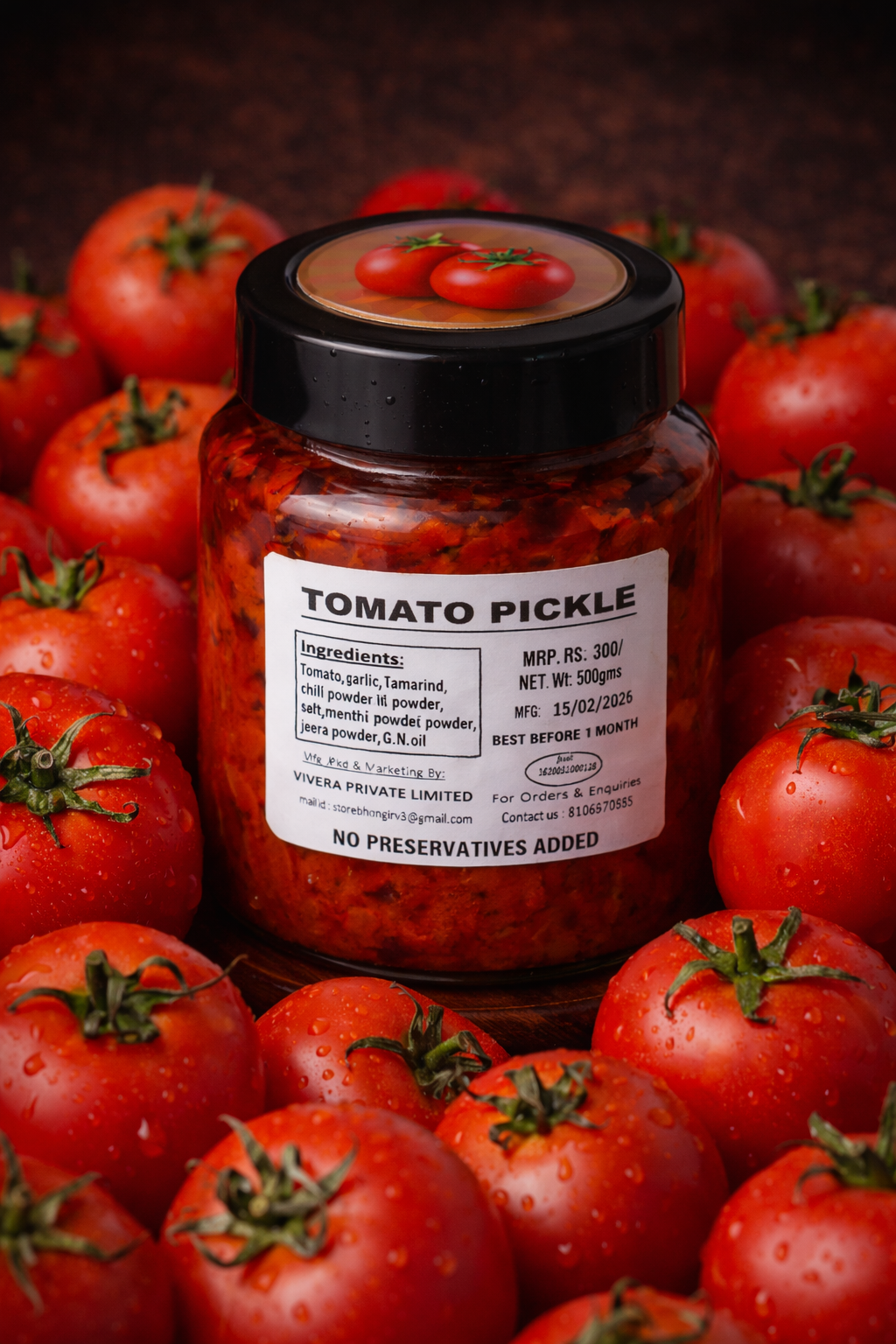 Tangy and spicy tomato pickle prepared with sun-ripened tomatoes and traditional spices.