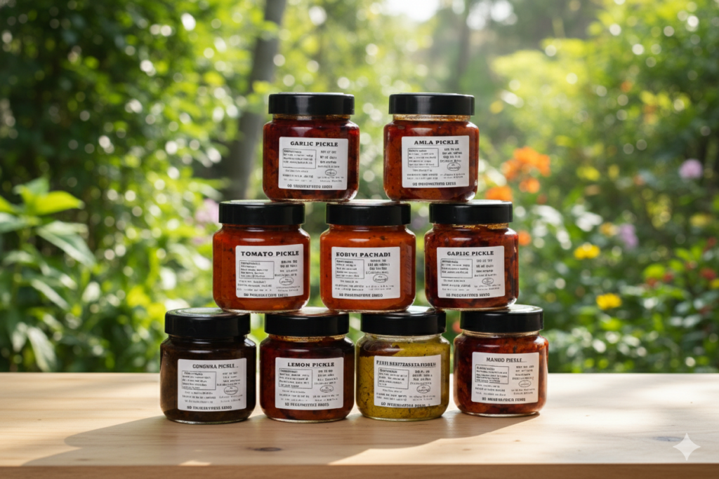 Tangy and spicy tomato pickle prepared with sun-ripened tomatoes and traditional spices.